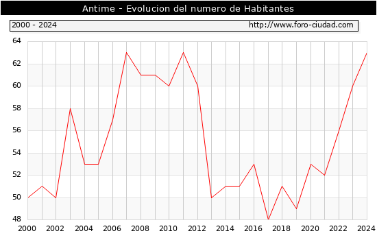 el numero de habitantes en Antime era de 63, 3 habitantes mas que el en el año 2023. En el grafico siguiente se puede ver cuantos habitantes tiene Antime a lo largo de los años.