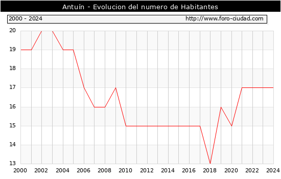 el numero de habitantes en Antuín era de 17, igual numero de habitantes que el en el año 2023. En el grafico siguiente se puede ver cuantos habitantes tiene Antuín a lo largo de los años.