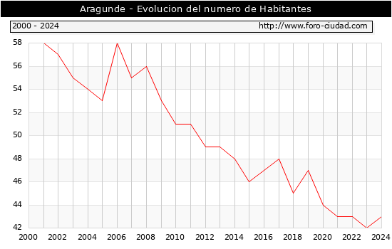 el numero de habitantes en Aragunde era de 43, 1 habitantes mas que el en el año 2023. En el grafico siguiente se puede ver cuantos habitantes tiene Aragunde a lo largo de los años.