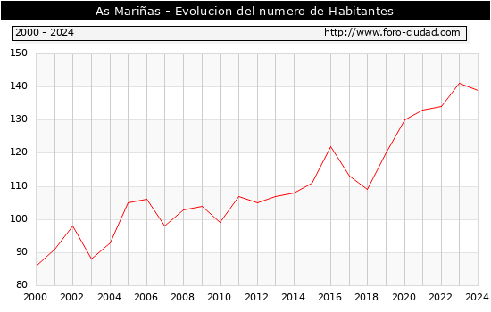 el numero de habitantes en As Mariñas era de 139, 2 habitantes menos que el en el año 2023. En el grafico siguiente se puede ver cuantos habitantes tiene As Mariñas a lo largo de los años.