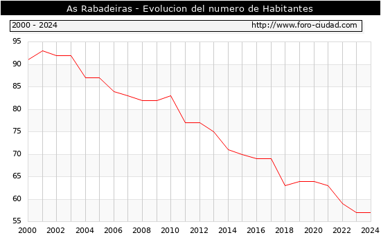 el numero de habitantes en As Rabadeiras era de 57, igual numero de habitantes que el en el año 2023. En el grafico siguiente se puede ver cuantos habitantes tiene As Rabadeiras a lo largo de los años.