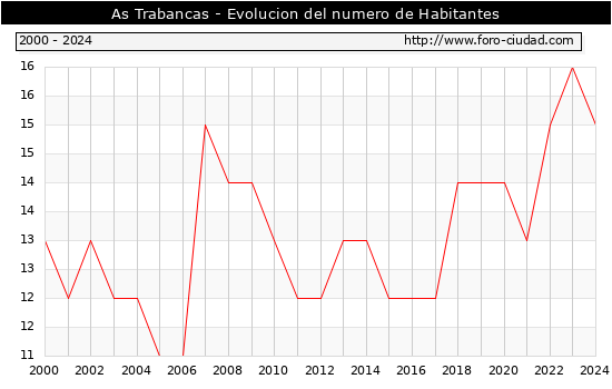 el numero de habitantes en As Trabancas era de 15, 1 habitantes menos que el en el año 2023. En el grafico siguiente se puede ver cuantos habitantes tiene As Trabancas a lo largo de los años.