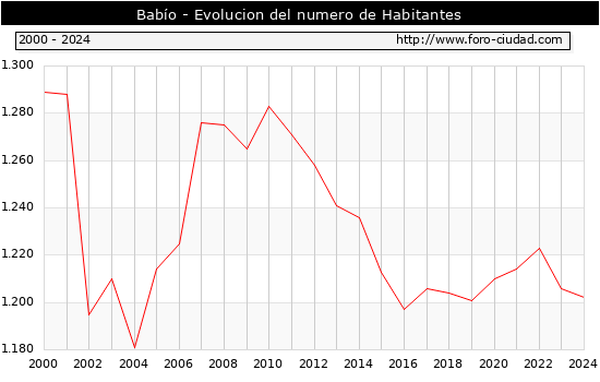 el numero de habitantes en Babío era de 1.202, 4 habitantes menos que el en el año 2023. En el grafico siguiente se puede ver cuantos habitantes tiene Babío a lo largo de los años.