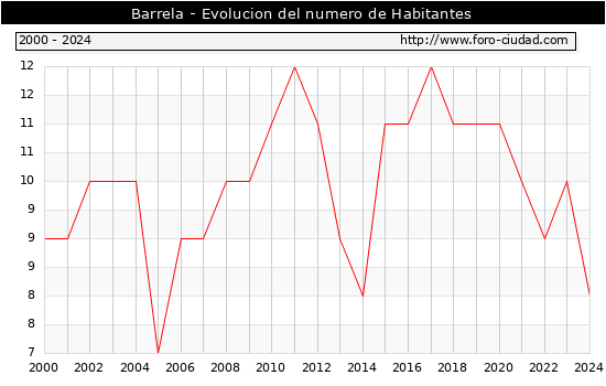 el numero de habitantes en Barrela era de 8, 2 habitantes menos que el en el año 2023. En el grafico siguiente se puede ver cuantos habitantes tiene Barrela a lo largo de los años.