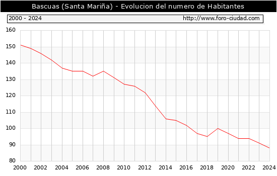 el numero de habitantes en Bascuas (Santa Mariña) era de 88, 3 habitantes menos que el en el año 2023. En el grafico siguiente se puede ver cuantos habitantes tiene Bascuas (Santa Mariña) a lo largo de los años.
