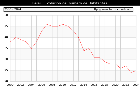 el numero de habitantes en Belai era de 25, 1 habitantes mas que el en el año 2023. En el grafico siguiente se puede ver cuantos habitantes tiene Belai a lo largo de los años.
