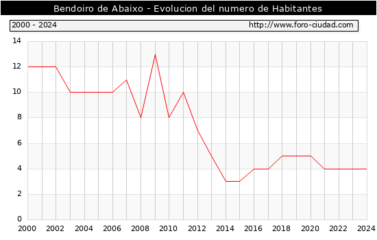 el numero de habitantes en Bendoiro de Abaixo era de 4, igual numero de habitantes que el en el año 2023. En el grafico siguiente se puede ver cuantos habitantes tiene Bendoiro de Abaixo a lo largo de los años.