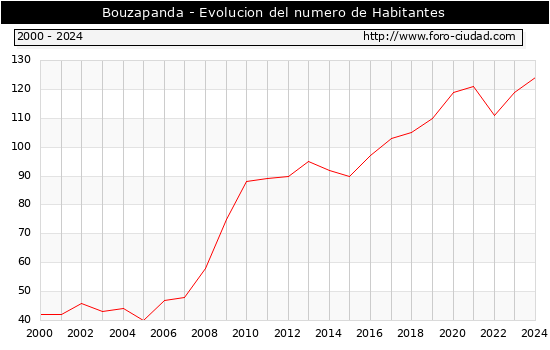 el numero de habitantes en Bouzapanda era de 124, 5 habitantes mas que el en el año 2023. En el grafico siguiente se puede ver cuantos habitantes tiene Bouzapanda a lo largo de los años.