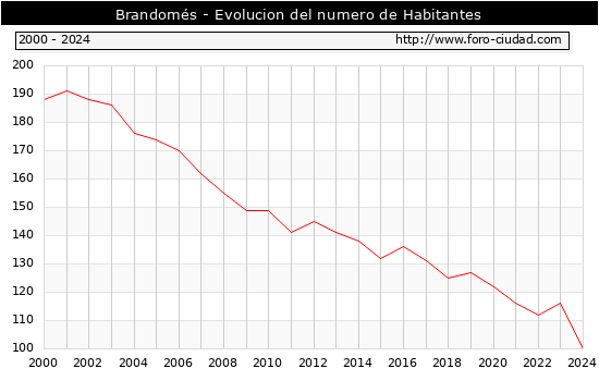 el numero de habitantes en Brandomés era de 100, 16 habitantes menos que el en el año 2023. En el grafico siguiente se puede ver cuantos habitantes tiene Brandomés a lo largo de los años.