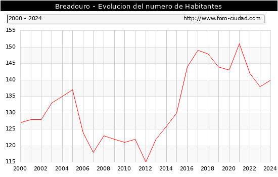 el numero de habitantes en Breadouro era de 140, 2 habitantes mas que el en el año 2023. En el grafico siguiente se puede ver cuantos habitantes tiene Breadouro a lo largo de los años.