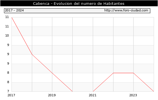 el numero de habitantes en Cabenca era de 7, 1 habitantes menos que el en el año 2023. En el grafico siguiente se puede ver cuantos habitantes tiene Cabenca a lo largo de los años.