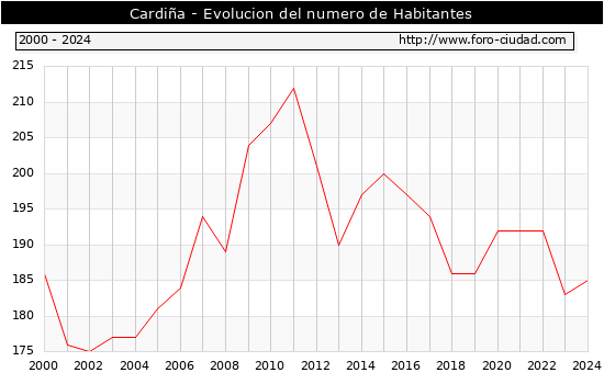 el numero de habitantes en Cardiña era de 185, 2 habitantes mas que el en el año 2023. En el grafico siguiente se puede ver cuantos habitantes tiene Cardiña a lo largo de los años.