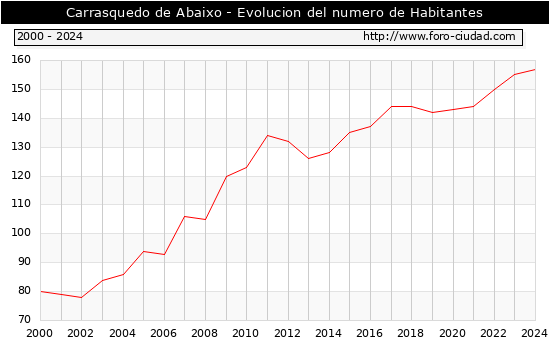el numero de habitantes en Carrasquedo de Abaixo era de 157, 2 habitantes mas que el en el año 2023. En el grafico siguiente se puede ver cuantos habitantes tiene Carrasquedo de Abaixo a lo largo de los años.
