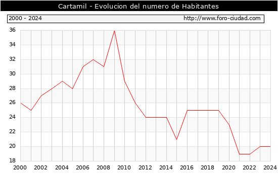 el numero de habitantes en Cartamil era de 20, igual numero de habitantes que el en el año 2023. En el grafico siguiente se puede ver cuantos habitantes tiene Cartamil a lo largo de los años.