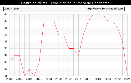 el numero de habitantes en Castro de Muras era de 31, 5 habitantes menos que el en el año 2023. En el grafico siguiente se puede ver cuantos habitantes tiene Castro de Muras a lo largo de los años.
