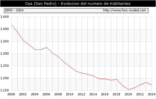 el numero de habitantes en Cea (San Pedro) era de 1.173, 11 habitantes menos que el en el año 2023. En el grafico siguiente se puede ver cuantos habitantes tiene Cea (San Pedro) a lo largo de los años.
