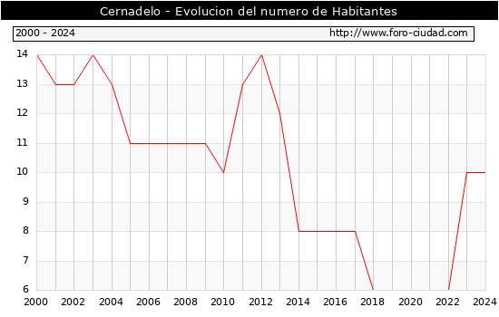 el numero de habitantes en Cernadelo era de 10, igual numero de habitantes que el en el año 2023. En el grafico siguiente se puede ver cuantos habitantes tiene Cernadelo a lo largo de los años.