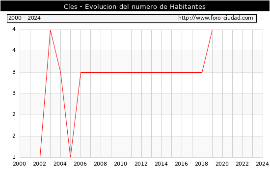el numero de habitantes en Cíes era de 4, igual numero de habitantes que el en el año 2023. En el grafico siguiente se puede ver cuantos habitantes tiene Cíes a lo largo de los años.