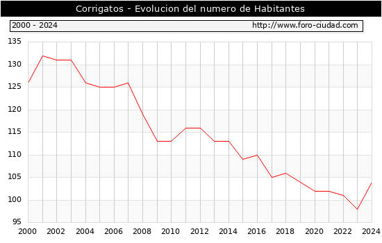 el numero de habitantes en Corrigatos era de 104, 6 habitantes mas que el en el año 2023. En el grafico siguiente se puede ver cuantos habitantes tiene Corrigatos a lo largo de los años.