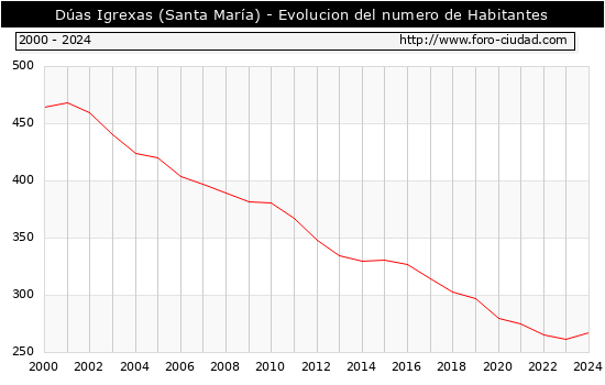 el numero de habitantes en Dúas Igrexas (Santa María) era de 267, 5 habitantes mas que el en el año 2023. En el grafico siguiente se puede ver cuantos habitantes tiene Dúas Igrexas (Santa María) a lo largo de los años.