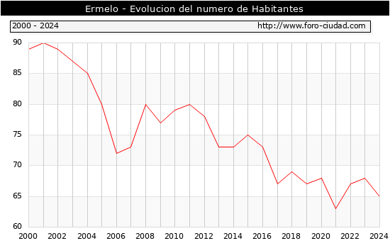 el numero de habitantes en Ermelo era de 65, 3 habitantes menos que el en el año 2023. En el grafico siguiente se puede ver cuantos habitantes tiene Ermelo a lo largo de los años.