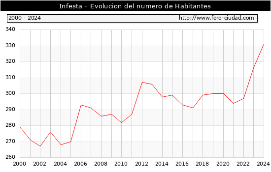 el numero de habitantes en Infesta era de 331, 15 habitantes mas que el en el año 2023. En el grafico siguiente se puede ver cuantos habitantes tiene Infesta a lo largo de los años.