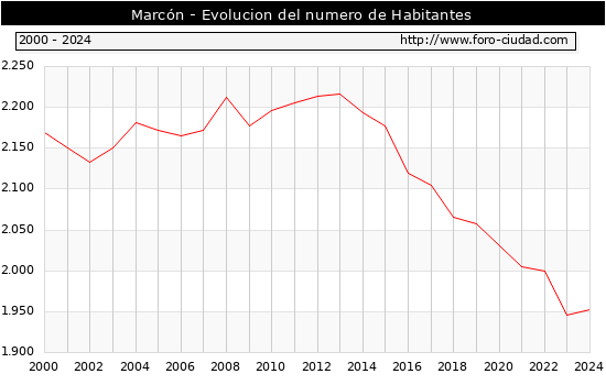 el numero de habitantes en Marcón era de 1.953, 7 habitantes mas que el en el año 2023. En el grafico siguiente se puede ver cuantos habitantes tiene Marcón a lo largo de los años.