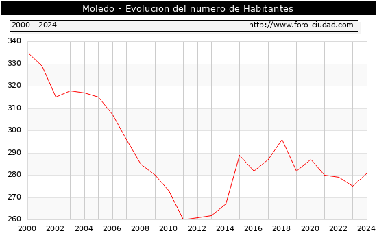 el numero de habitantes en Moledo era de 281, 6 habitantes mas que el en el año 2023. En el grafico siguiente se puede ver cuantos habitantes tiene Moledo a lo largo de los años.