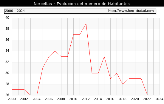 el numero de habitantes en Nercellas era de 26, igual numero de habitantes que el en el año 2023. En el grafico siguiente se puede ver cuantos habitantes tiene Nercellas a lo largo de los años.