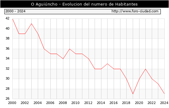 el numero de habitantes en O Aguiúncho era de 27, 2 habitantes menos que el en el año 2023. En el grafico siguiente se puede ver cuantos habitantes tiene O Aguiúncho a lo largo de los años.