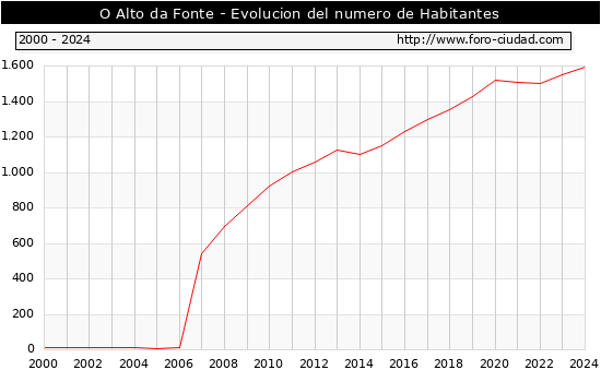 Segun los datos publicados por el INE a 1 de Enero de 2024 el numero de habitantes en O Alto da Fonte era de 1.595, 47 habitantes mas que el en el año 2023. En el grafico siguiente se puede ver cuantos habitantes tiene O Alto da Fonte a lo largo de los años.