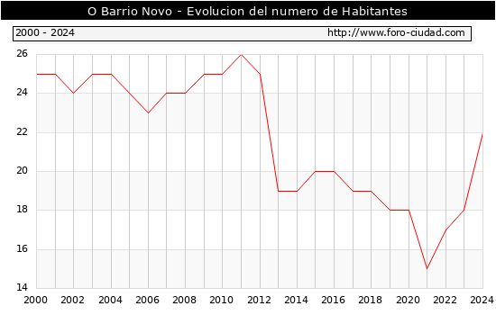 el numero de habitantes en O Barrio Novo era de 22, 4 habitantes mas que el en el año 2023. En el grafico siguiente se puede ver cuantos habitantes tiene O Barrio Novo a lo largo de los años.