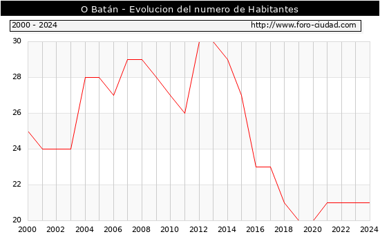 el numero de habitantes en O Batán era de 21, igual numero de habitantes que el en el año 2023. En el grafico siguiente se puede ver cuantos habitantes tiene O Batán a lo largo de los años.