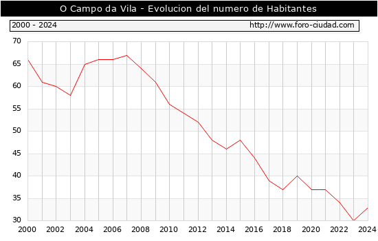 el numero de habitantes en O Campo da Vila era de 33, 3 habitantes mas que el en el año 2023. En el grafico siguiente se puede ver cuantos habitantes tiene O Campo da Vila a lo largo de los años.