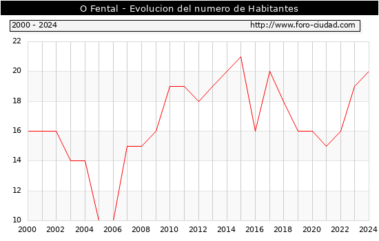 el numero de habitantes en O Fental era de 20, 1 habitantes mas que el en el año 2023. En el grafico siguiente se puede ver cuantos habitantes tiene O Fental a lo largo de los años.