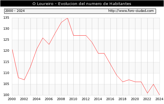 el numero de habitantes en O Loureiro era de 100, 5 habitantes menos que el en el año 2023. En el grafico siguiente se puede ver cuantos habitantes tiene O Loureiro a lo largo de los años.