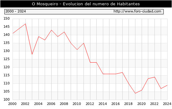 el numero de habitantes en O Mosqueiro era de 109, 2 habitantes mas que el en el año 2023. En el grafico siguiente se puede ver cuantos habitantes tiene O Mosqueiro a lo largo de los años.