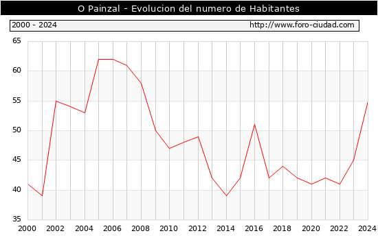 el numero de habitantes en O Painzal era de 55, 10 habitantes mas que el en el año 2023. En el grafico siguiente se puede ver cuantos habitantes tiene O Painzal a lo largo de los años.