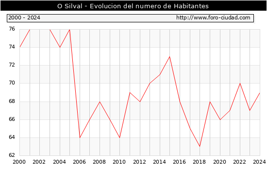 el numero de habitantes en O Silval era de 69, 2 habitantes mas que el en el año 2023. En el grafico siguiente se puede ver cuantos habitantes tiene O Silval a lo largo de los años.
