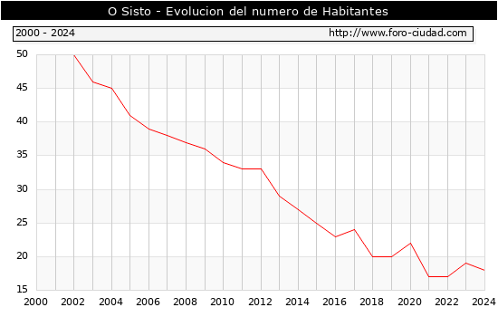 el numero de habitantes en O Sisto era de 18, 1 habitantes menos que el en el año 2023. En el grafico siguiente se puede ver cuantos habitantes tiene O Sisto a lo largo de los años.