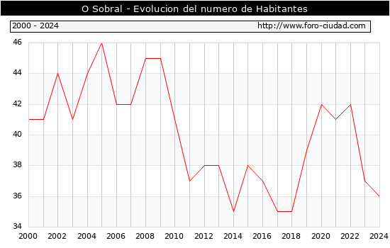 el numero de habitantes en O Sobral era de 36, 1 habitantes menos que el en el año 2023. En el grafico siguiente se puede ver cuantos habitantes tiene O Sobral a lo largo de los años.