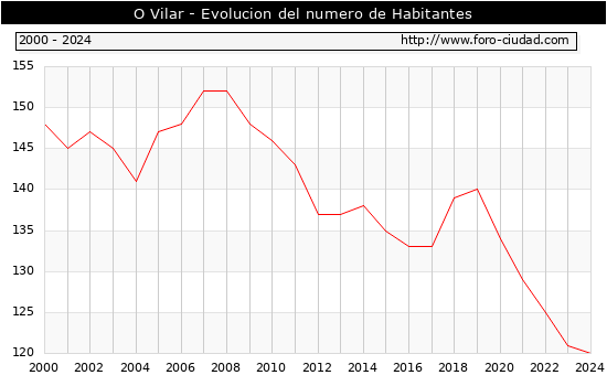 el numero de habitantes en O Vilar era de 120, 1 habitantes menos que el en el año 2023. En el grafico siguiente se puede ver cuantos habitantes tiene O Vilar a lo largo de los años.