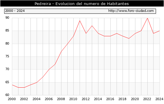 el numero de habitantes en Pedreira era de 85, 1 habitantes mas que el en el año 2023. En el grafico siguiente se puede ver cuantos habitantes tiene Pedreira a lo largo de los años.