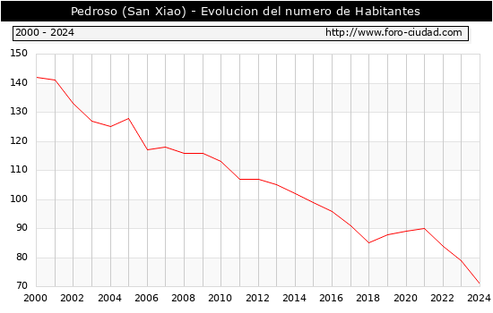 el numero de habitantes en Pedroso (San Xiao) era de 71, 8 habitantes menos que el en el año 2023. En el grafico siguiente se puede ver cuantos habitantes tiene Pedroso (San Xiao) a lo largo de los años.