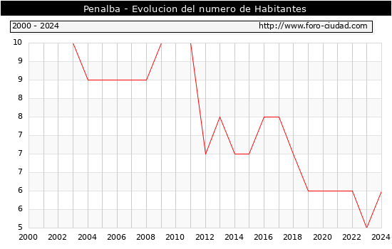 el numero de habitantes en Penalba era de 6, 1 habitantes mas que el en el año 2023. En el grafico siguiente se puede ver cuantos habitantes tiene Penalba a lo largo de los años.