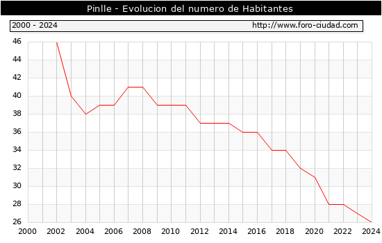 el numero de habitantes en Pinlle era de 26, 1 habitantes menos que el en el año 2023. En el grafico siguiente se puede ver cuantos habitantes tiene Pinlle a lo largo de los años.