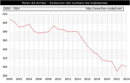 el numero de habitantes en Porto de Arriba era de 301, 5 habitantes menos que el en el año 2023. En el grafico siguiente se puede ver cuantos habitantes tiene Porto de Arriba a lo largo de los años.