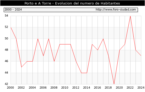 el numero de habitantes en Porto e A Torre era de 47, 1 habitantes menos que el en el año 2023. En el grafico siguiente se puede ver cuantos habitantes tiene Porto e A Torre a lo largo de los años.