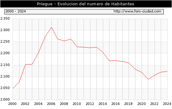 el numero de habitantes en Priegue era de 2.122, 2 habitantes mas que el en el año 2023. En el grafico siguiente se puede ver cuantos habitantes tiene Priegue a lo largo de los años.
