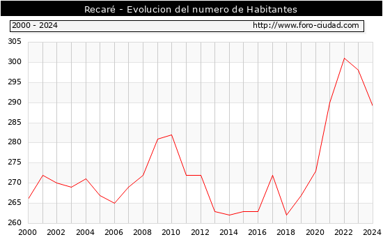 el numero de habitantes en Recaré era de 289, 9 habitantes menos que el en el año 2023. En el grafico siguiente se puede ver cuantos habitantes tiene Recaré a lo largo de los años.